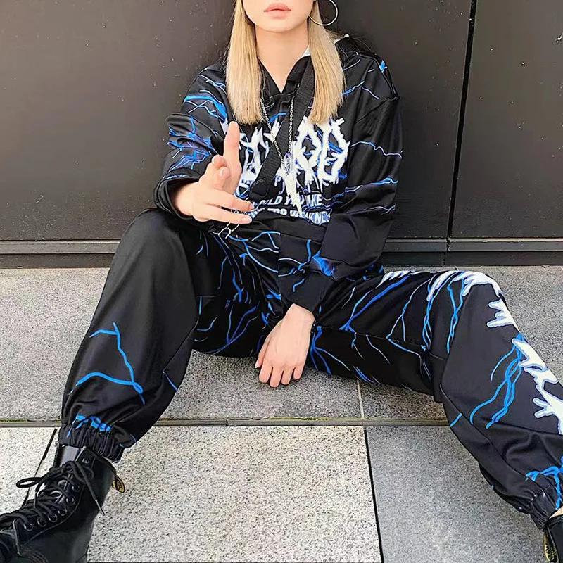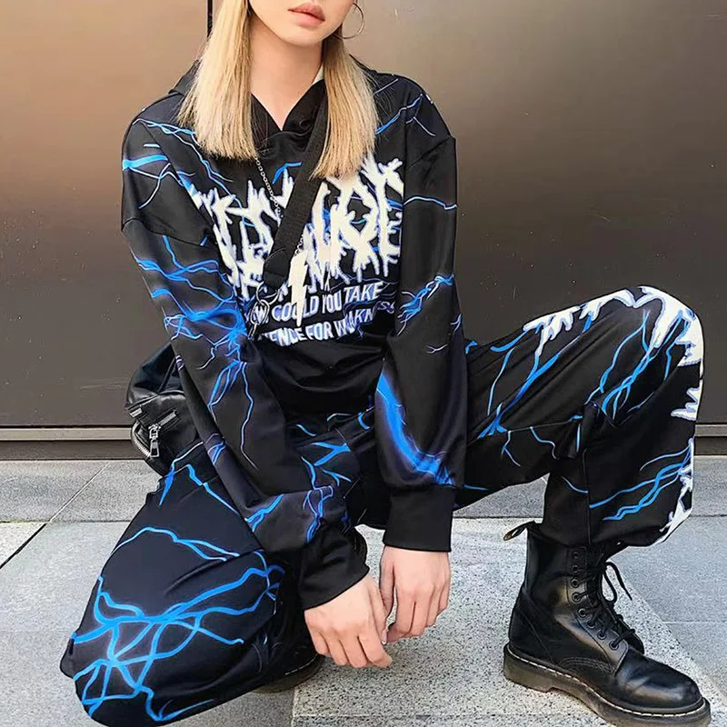 Images of Fitshinling Lightning Print Gothic Women Matching Sets 2020 Sweatshirts Sweatpants 2 Piece Outfits Athleisure Grunge Tracksuit :