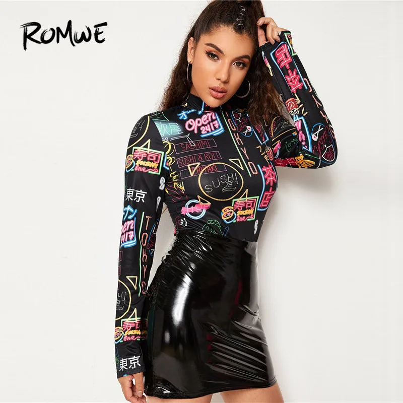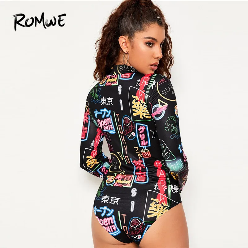 Sale ROMWE Mock Neck Letter Print Bodysuit For Women Long Sleeve Bodysuit Spring Streetwear Bodycon Black Bodysuit Jumpsuit Body Suit