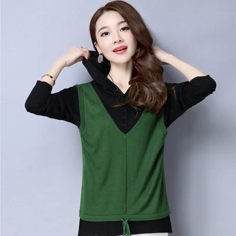 New Women Casual Hooded Sweaters Autumn Spring Fake Two Piece Knitted Hood Pullovers Female Pink Red Yellow Patchwork Knitwear Woman