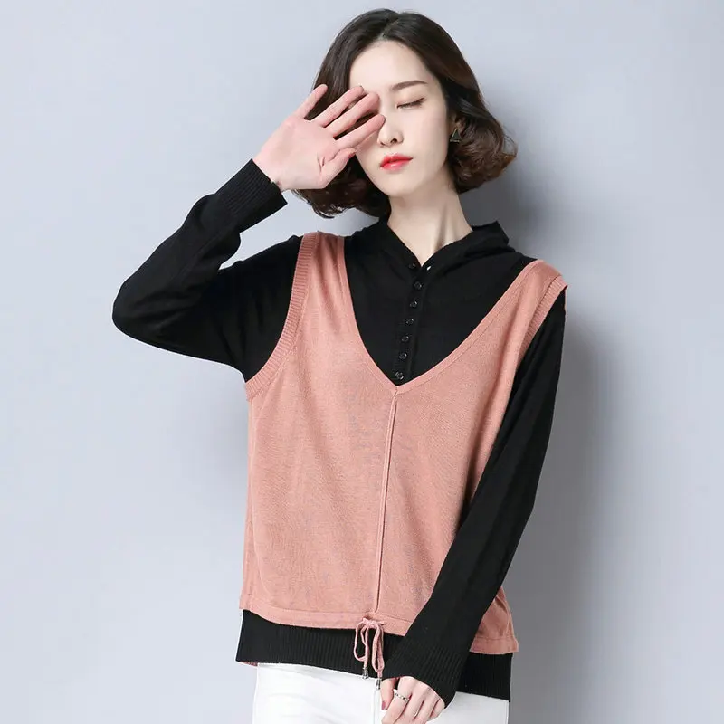 Promo Women Casual Hooded Sweaters Autumn Spring Fake Two Piece Knitted Hood Pullovers Female Pink Red Yellow Patchwork Knitwear Woman