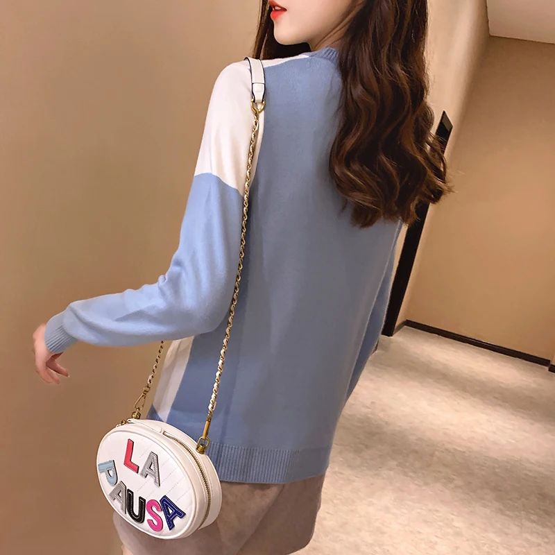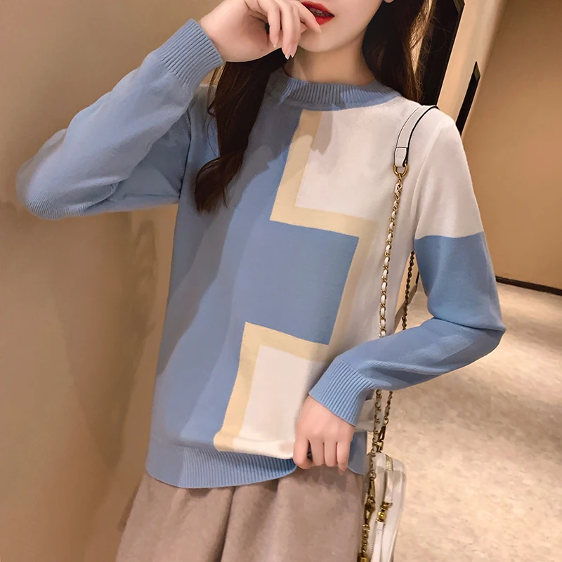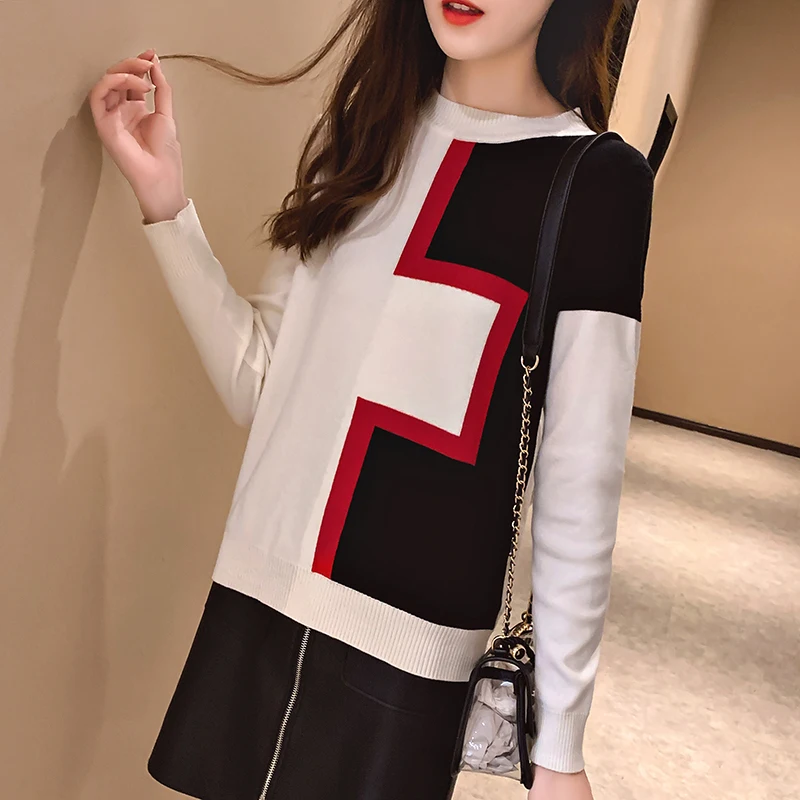 Images of Sweater Women for Winter 2019 Fashion Autumn Contrast Color Patchwork Knitted Long Sleeve Pullover Female Tricot Jumper Femme :