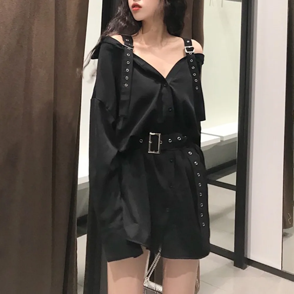 Images of 2019 New Autumn Fashion Gothic Korean Style Black Women Dress Straight Belt Button Casual Plain Girls Plus Size Female Dresses :