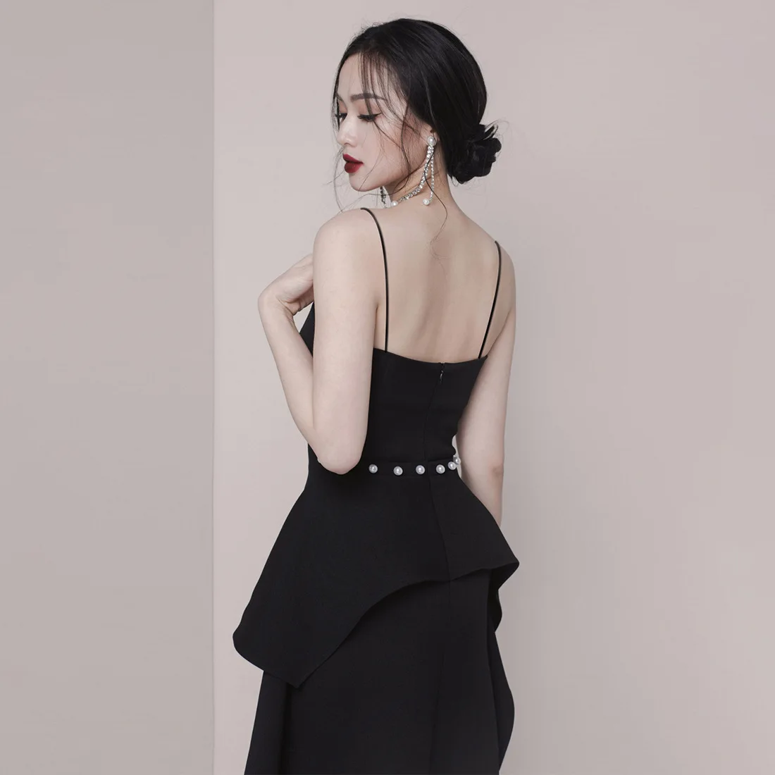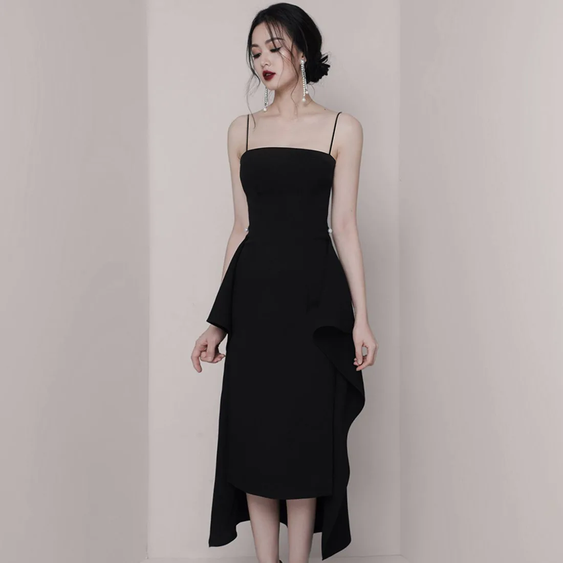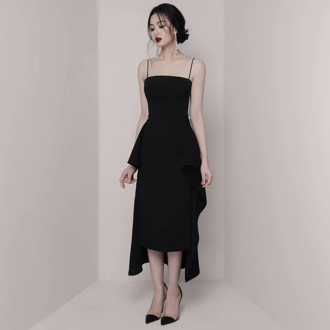 New Luxurious Spring Summer Fashion Solid Spaghetti Straps Sheath Party Women Dress Sexy Black Irregularity Strapless Backless Dress