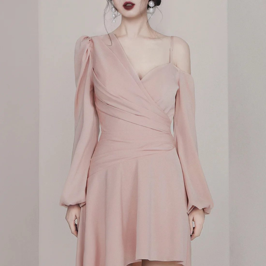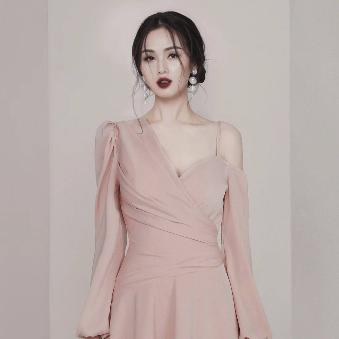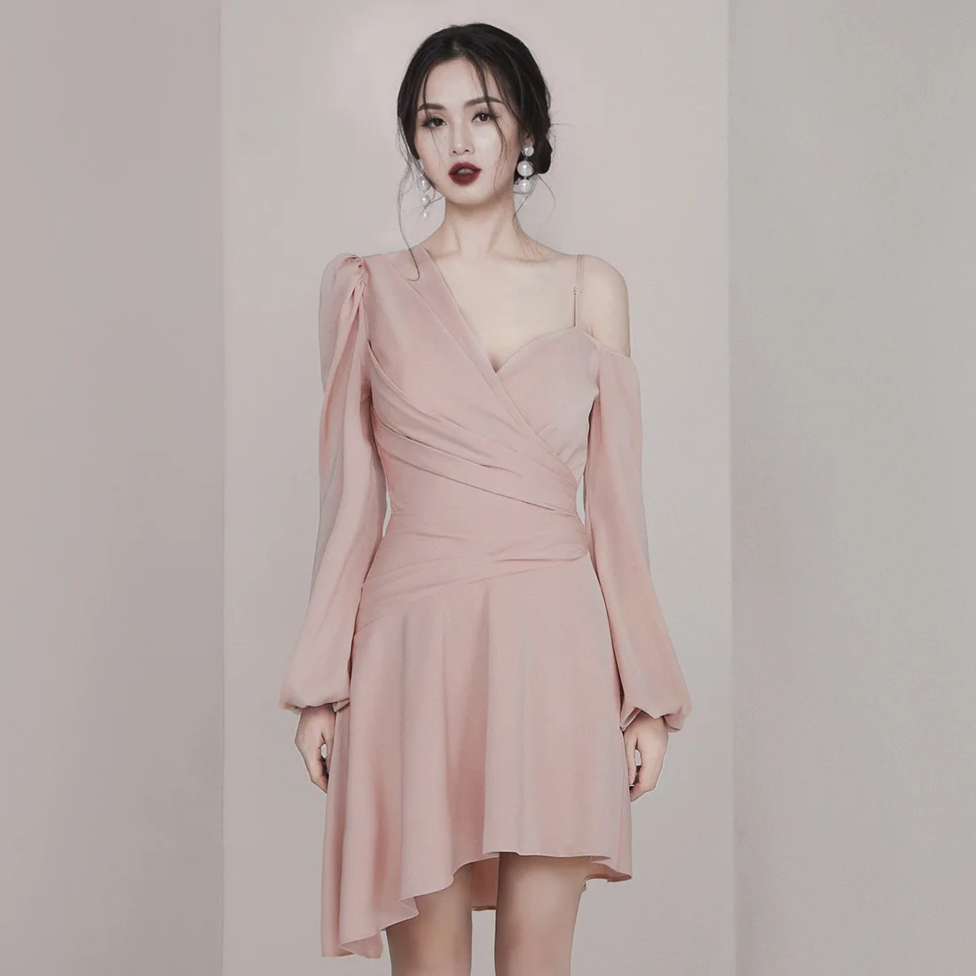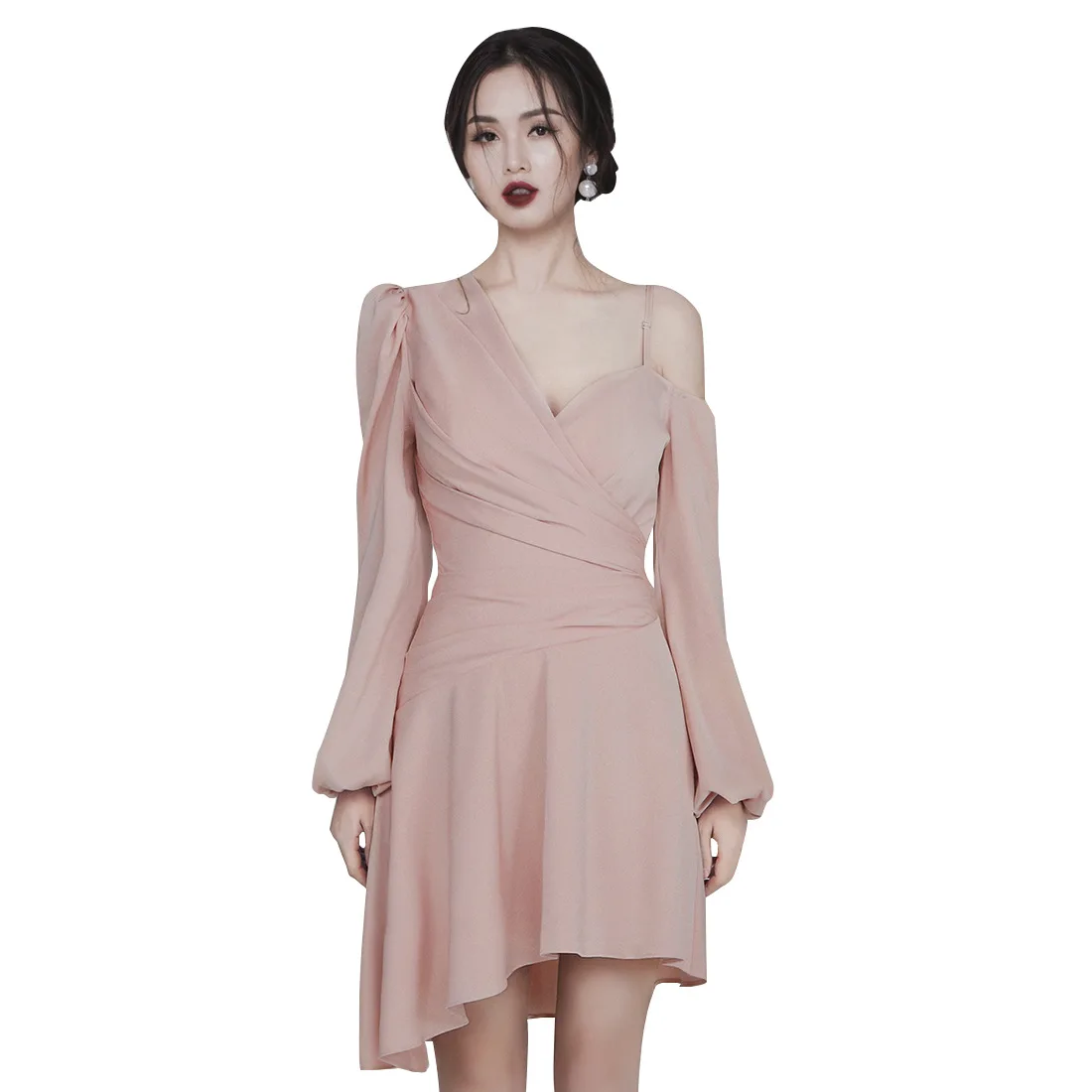Images of Autumn 2019 New Fashion Women's Sexy Off Shoulder Solid Pink Party Dress Long Sleeve Medium Length V Neck Sheath Dress Women :